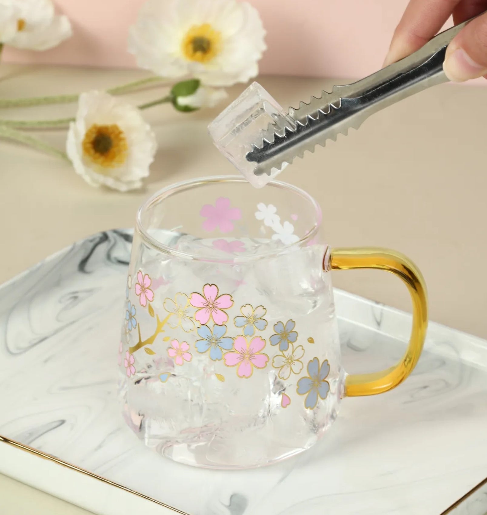 Beautifully unique glass cherry blossom mug with gold accent handles.